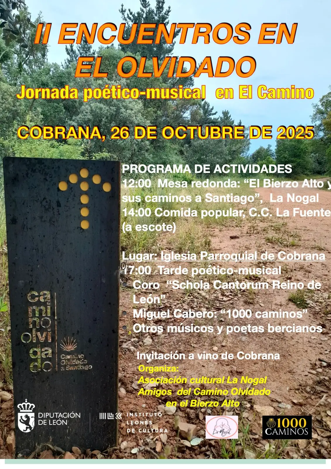 El próximo 26 de octubre de 2025 la localidad de Cobrana, en El Bierzo Alto, acogerá los “II Encuentros en el Olvidado”, una jornada dedicada a la cultura, la poesía y la música en el marco del Camino Olvidado a Santiago. El evento está organizado por la Asociación Cultural La Nogal y los Amigos del Camino Olvidado en el Bierzo Alto.