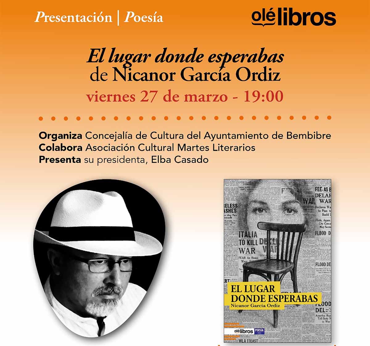 Este próximo viernes, 27 de marzo, a las 19:00 horas, en La Cas de las Culturas de Bembibre, Nicanor García Ordíz presenta su nuevo poemario “El lugar donde esperabas”, con la colaboración de la asociación Martes Literarios, acompañado por Elba Casado.