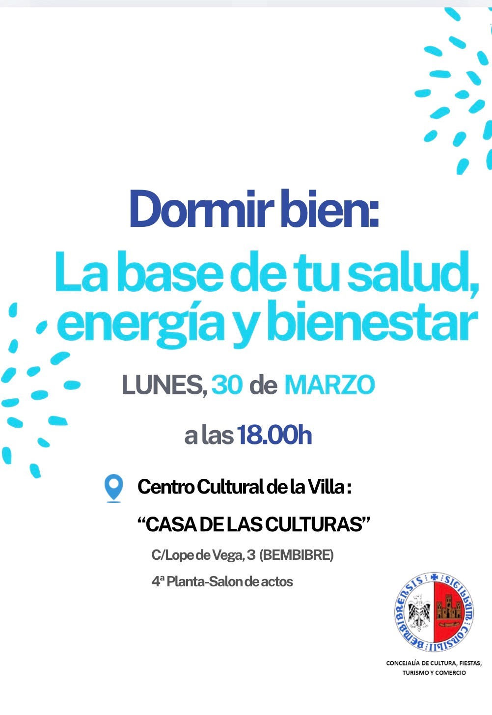 Este próximo lunes 30 de marzo, a las 18:00 horas, en el salón de actos de la Casa de las Culturas, tendrá lugar la conferencia “El valor del sueño y el descanso como pilar de salud”. Está organizada por la Concejalía de Cultura, Fiestas, Turismo y Comercio del Ayuntamiento de Bembibre.