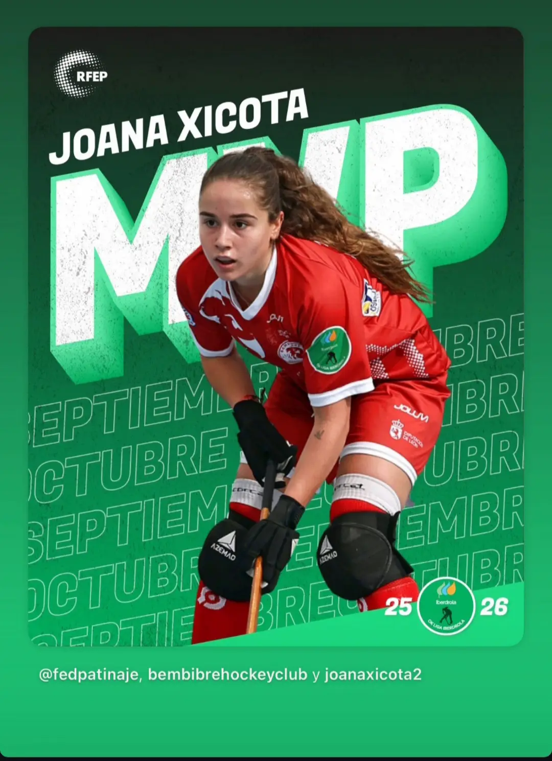 La Real Federación Española de Patinaje ha distinguido a la jugadora del Bembibre HC, Joana Xicota, como la primera MVP de la OK Liga Iberdrola en los meses de septiembre y octubre, destacando así su gran rendimiento y su peso en el juego del equipo. Un hecho que no ha pasado por alto la entidad deportiva, que ha trasladado públicamente su enhorabuena a la jugadora por este reconocimiento como jugadora profesional de hockey sobre patines.