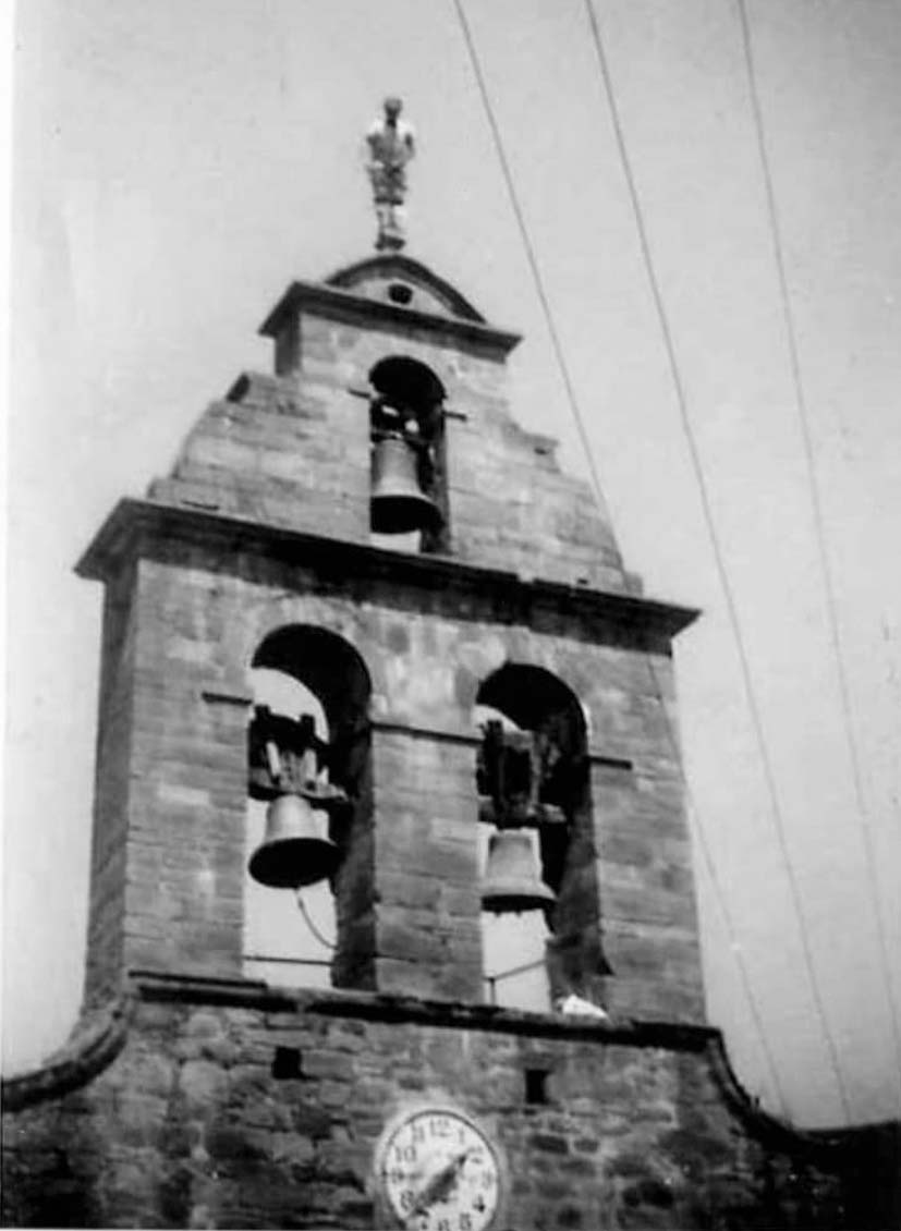 Comenzó agarrándose al yugo de la campana de la derecha y apoyando un pie en el gancho que sujeta las cadenas de los badajos clavado en el pilar a un metro del suelo del rellano. Después se colgó de la moldura del pilar, medio metro por encima de su cabeza. Paso a paso fue coordinando los movimientos de brazos y piernas, pegado a la pared como las lagartijas cuando trepan, hasta alcanzar la cornisa. En todo el tramo, en cada agarre y en cada apoyo, sintió la rugosidad y dureza de la piedra en los dedos de las manos y de los pies descalzos. Ya en la base del capitel le fue fácil alcanzar la veleta. Puso un pie a cada lado y en posición vertical y agarrado a ella se mantuvo firme. Abajo algunos contuvieron el aliento, otros decían preocupadas frases sueltas, pero la mayoría de ellos asistían al espectáculo confiados.