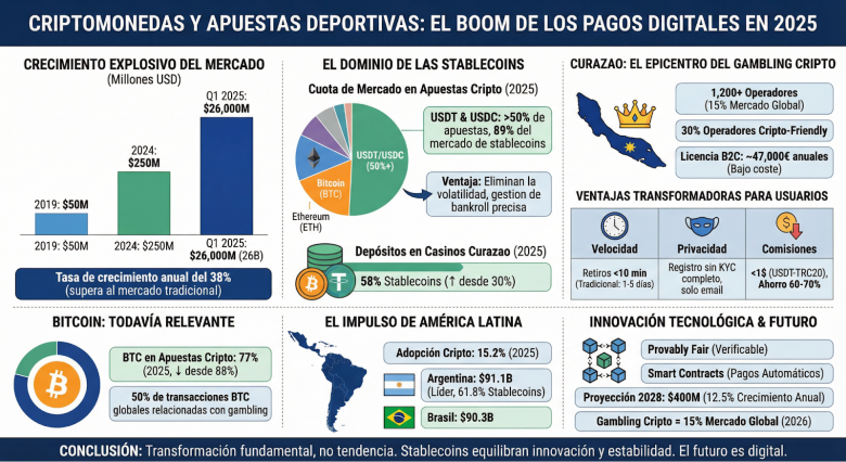 El sector de las apuestas deportivas online está experimentando una revolución impulsada por las criptomonedas. Los números son contundentes: el mercado de gambling con activos digitales ha pasado de 50 millones de dólares en 2019 a 250 millones en 2024, una tasa de crecimiento anual del 38% que supera ampliamente la del mercado tradicional. Solo en el primer trimestre de 2025, se apostaron 26 mil millones de dólares utilizando criptomonedas, casi el doble que el año anterior.