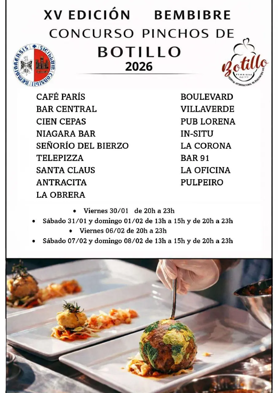 La programación del LIII Festival Internacional de Exaltación del Botillo de Bembibre avanza con una de sus citas más emblemáticas: las XV Jornadas de Pinchos del Botillo, que este año registran la participación más elevada de los últimos años, con 17 establecimientos inscritos en el concurso.